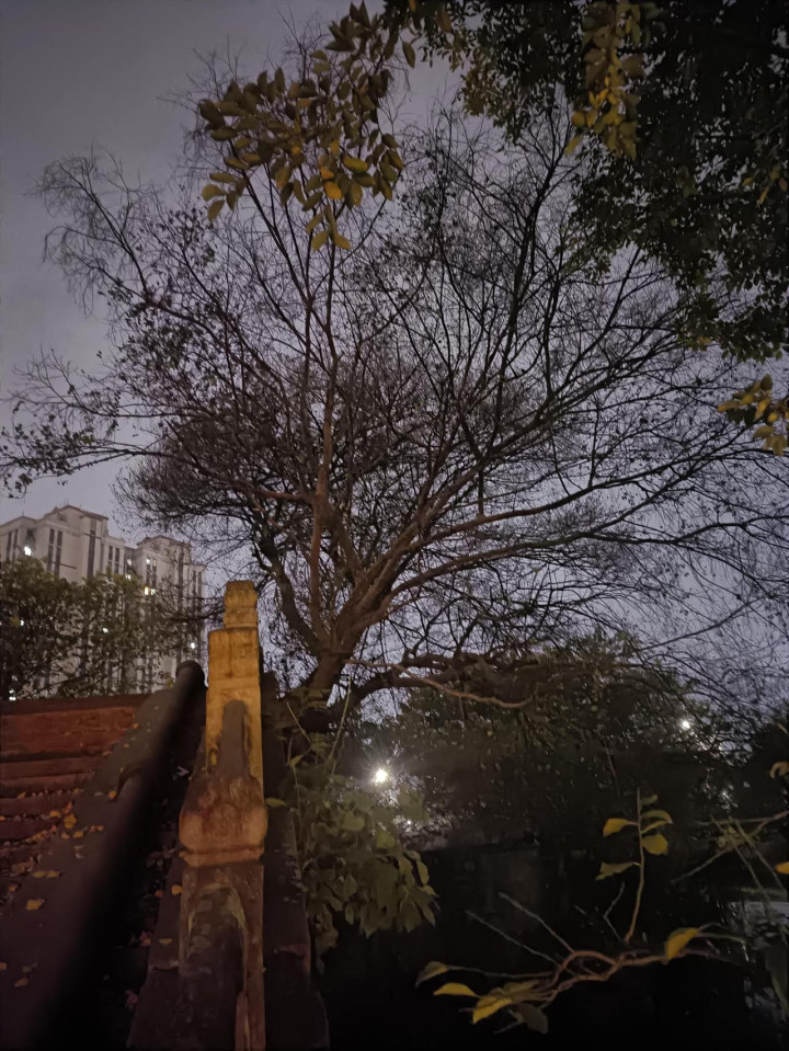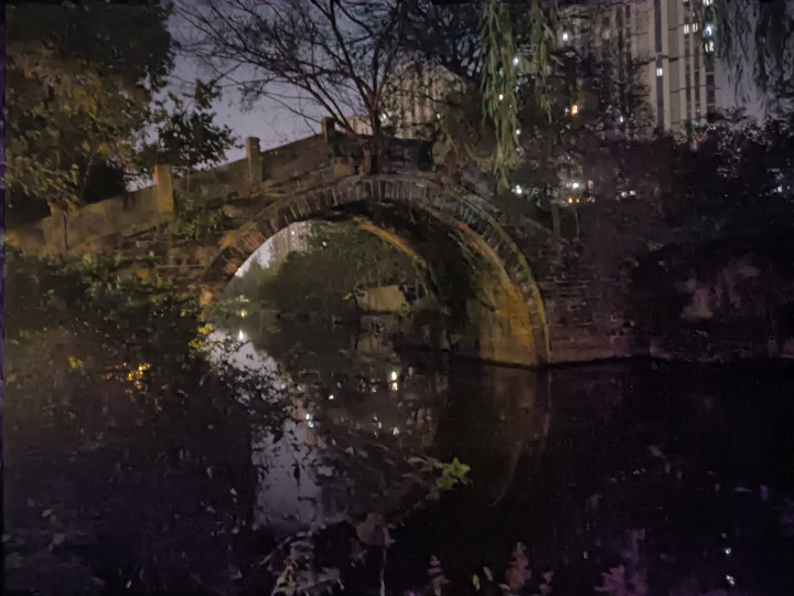 步行约四十分钟,我们抵达望春桥西侧的双塘河桥。站在桥中央向东望去,一两百米外的望春桥已被夜色笼上一层薄纱,古桥的轮廓在树影间若隐若现,恰似“犹抱琵琶半遮面”的古典佳人,透着朦胧之美。远处高楼灯火化作古桥的背景板,仿佛把千年岁月沉淀的故事都藏在薄纱之后,静待我们走近揭开它那神秘的面纱。