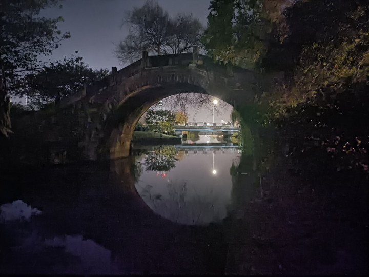 我小心翼翼走到桥东侧河边,想细赏望春桥的侧身风姿。秋夜如淡墨浸染古桥,单孔半圆形石拱似被岁月磨润的墨玉,静静嵌在河面,与水中倒影相映,仿佛在空中勾勒出一个“大月亮”。它如夜的画框,框住了远处双塘河桥的灯影,也框住了两岸树桠的疏影,古桥与新桥隔空相拥成“桥中桥”,在夜色里叠成一段古今对话的慢时光。