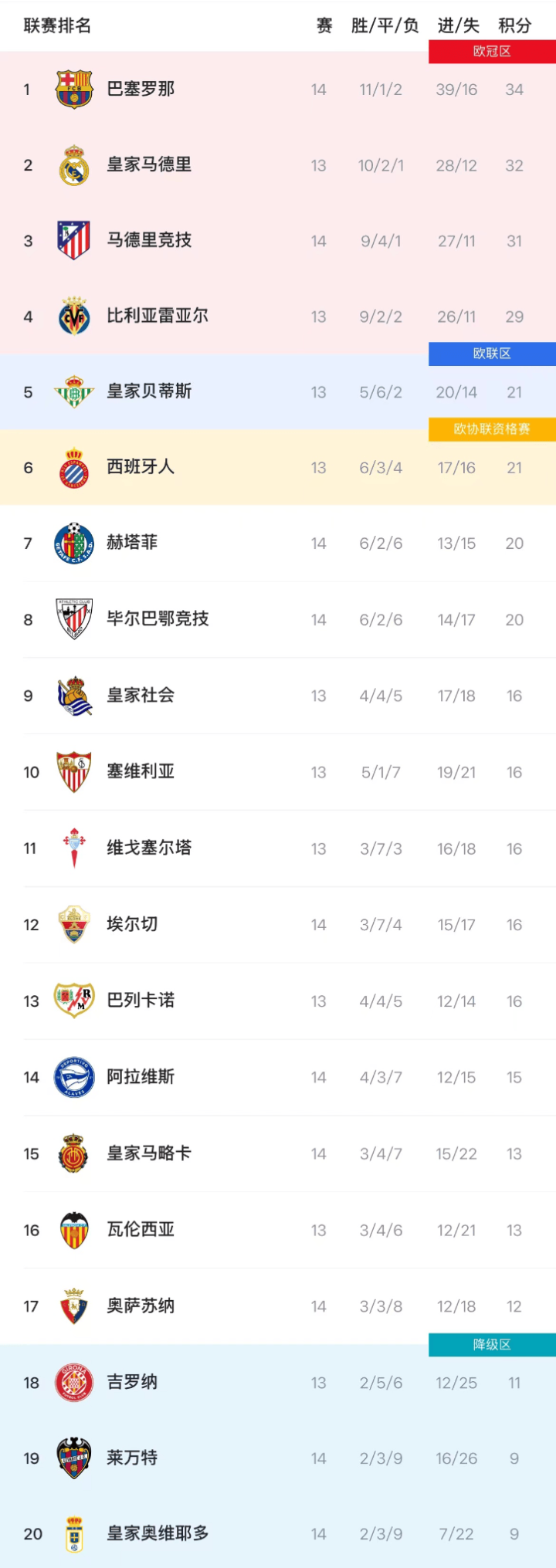 欧战席位的竞争同样激烈。皇家贝蒂斯和西班牙人同为21分,分列第五、第六。赫塔费主场1比0小胜埃尔切后,积分来到20分,毕尔巴鄂竞技做客2比0击败莱万特,同样积20分,凭借净胜球紧随其后,两队分列第七第八。