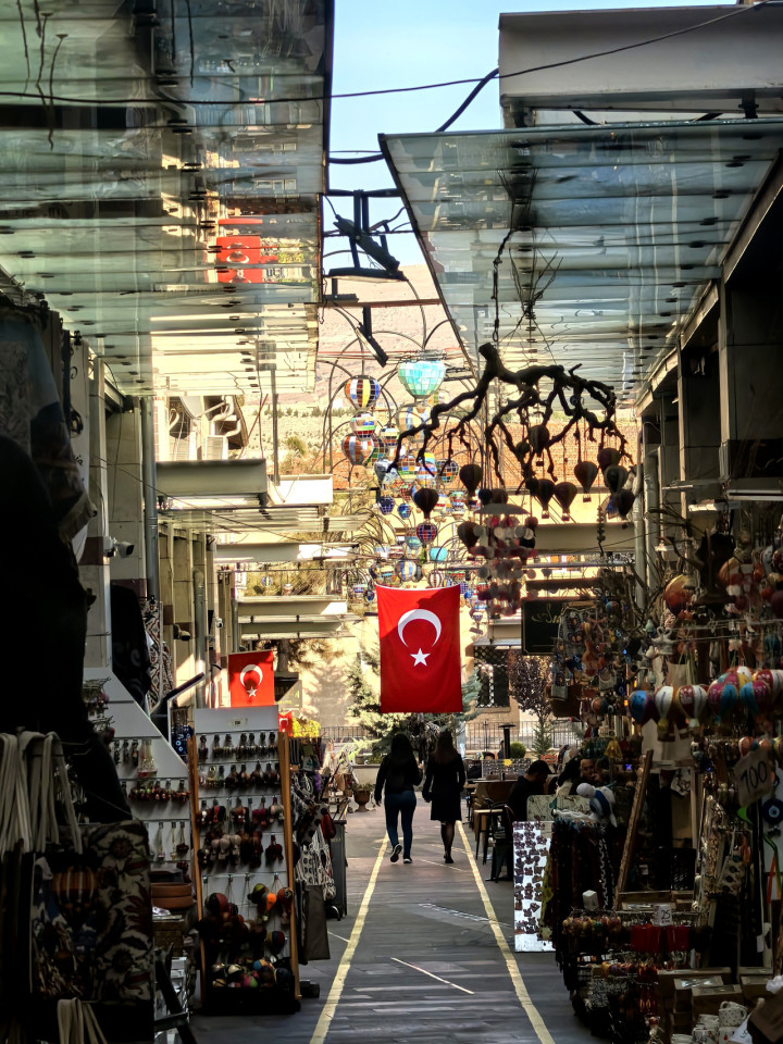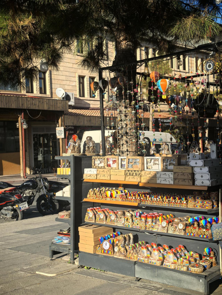 街道小店琳琅满目,地毯店里挂着色彩斑斓的手工艺品,蓝眼睛挂饰在橱窗里闪着光,陶器店的货架上摆着造型古朴的陶罐,每一件都透着当地人的巧思。我踱进一家工艺店,拥挤的屋子里摆满了热气球造型的工艺品,木质的、陶瓷的、金属的,一个个色彩鲜艳,小巧玲珑,看得人爱不释手。