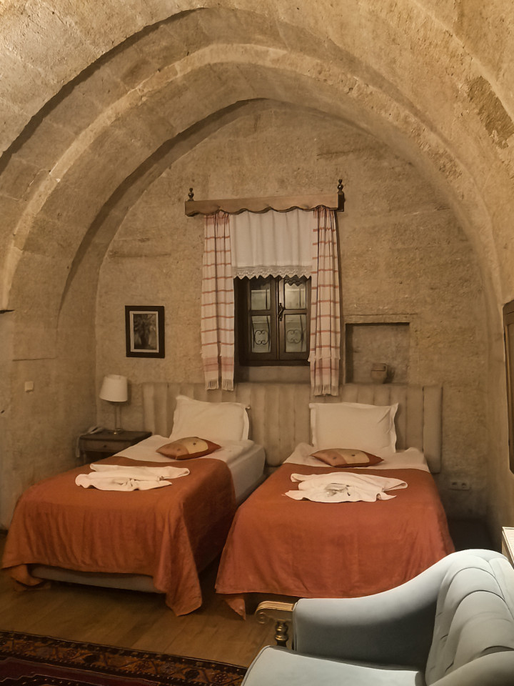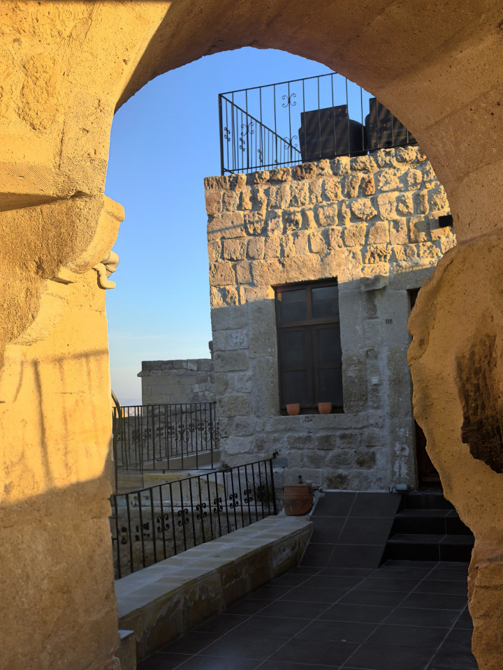 这家酒店在山坡上一座教堂对面,得拎着包跨几十级台阶到达,行李箱则由酒店专人帮忙运到前台。推开房门的瞬间,新奇感便带着岩穴特有的微凉气息扑面而来。房间全无平常酒店的规整模样,依着天然岩洞的走势开凿而成,墙壁上还留着风蚀雨凿的斑驳痕迹,粗糙的质感里藏着原始的温柔。拱形的穹顶悬着一盏复古的铜灯,暖黄的光晕落下来,给石桌石椅镀上一层柔和的金边。