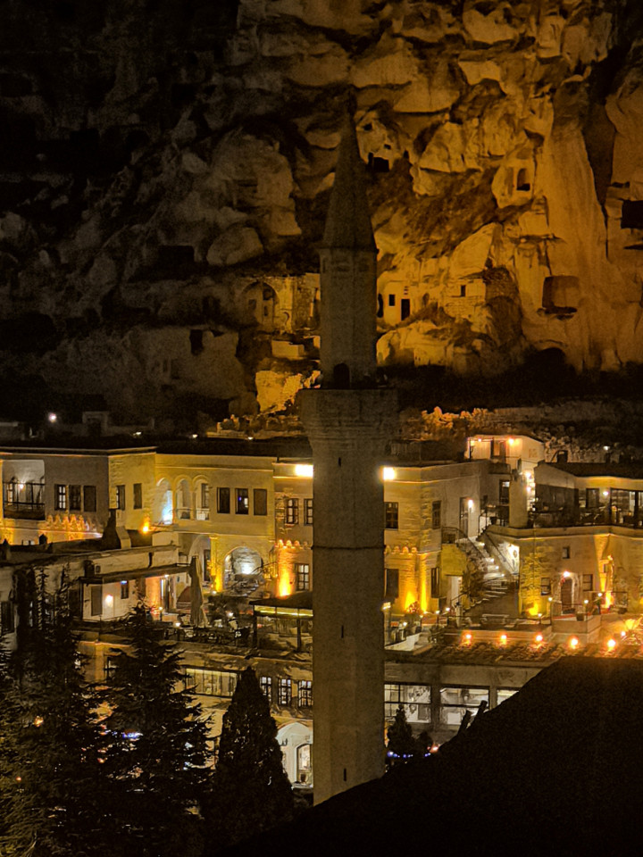 在卡帕多奇亚区域,于尔居普虽然并不特别出挑,但它以众多的山岩洞穴酒店而闻名,比格雷梅更繁华更休闲。抵达时已经是晚上七点左右,山脚下的小镇街道灯火璀璨,而洞穴酒店星星点点的光从石屋中渗出来,与天际的星星遥遥相望,像一场开启的梦。