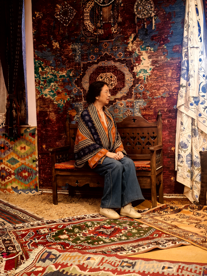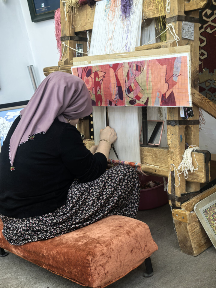 午后我们特地去探访了那家声名远扬的网红毛毯屋。还未进门,便被门口悬挂的织毯晃花了眼,绯红、靛蓝、明黄等五颜六色的色块交织成繁复的几何纹样,这是塞尔柱游牧时期流传下来的图案,带着浓郁的异域风情。