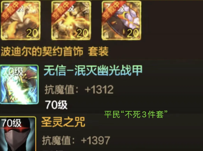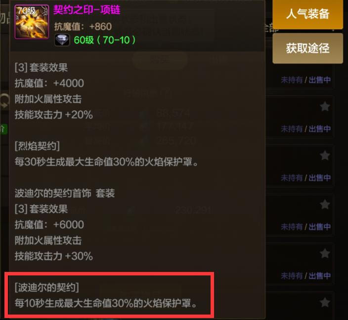 这套契约首饰套在超越地下城更新前那真的是无人问津,其属性也是根本比不上恍惚套等主流T0首饰套的。但这次超越地下城更新后,这套T5史诗套却是一跃成为T0史诗套,就连恍惚套都是比不过了。这套首饰套的属性很一般,增加的伤害肯定是比不上恍惚套的。但是这契约套有一个重要属性是其他史诗套所比不了的,那就是每10秒可以生成30%生命值的火焰保护罩啊。这在缺少防御超越地下城中可是非常重要的,关键时候可以省下不少的复活币。