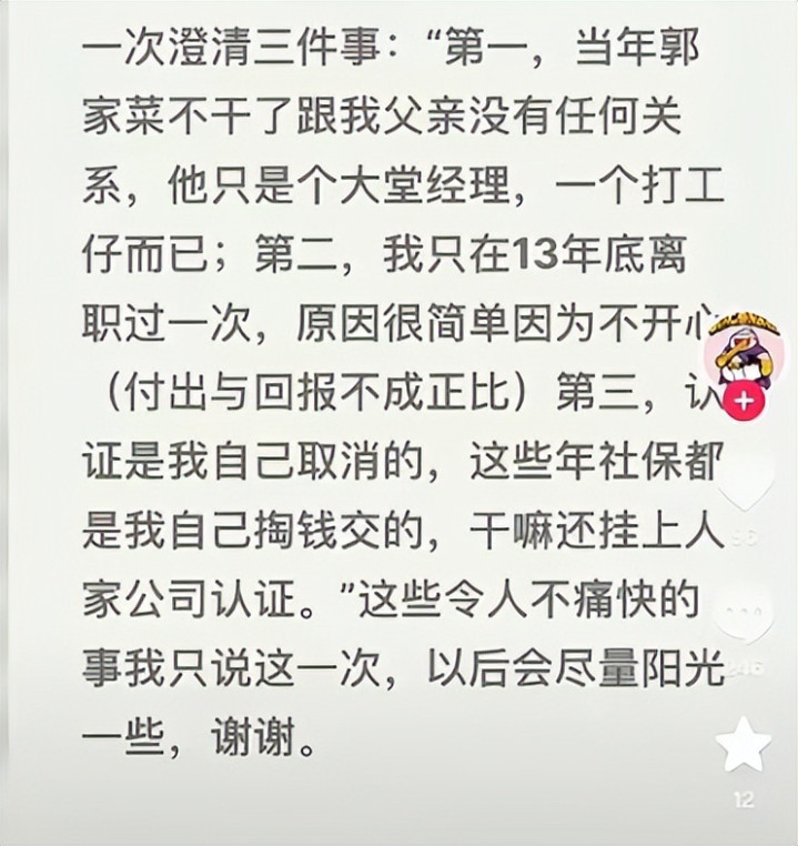 第一件事,宁云祥称当年郭家菜不干了,跟他父亲没有任何关系,他只是个大堂经理,一个打工仔而已。