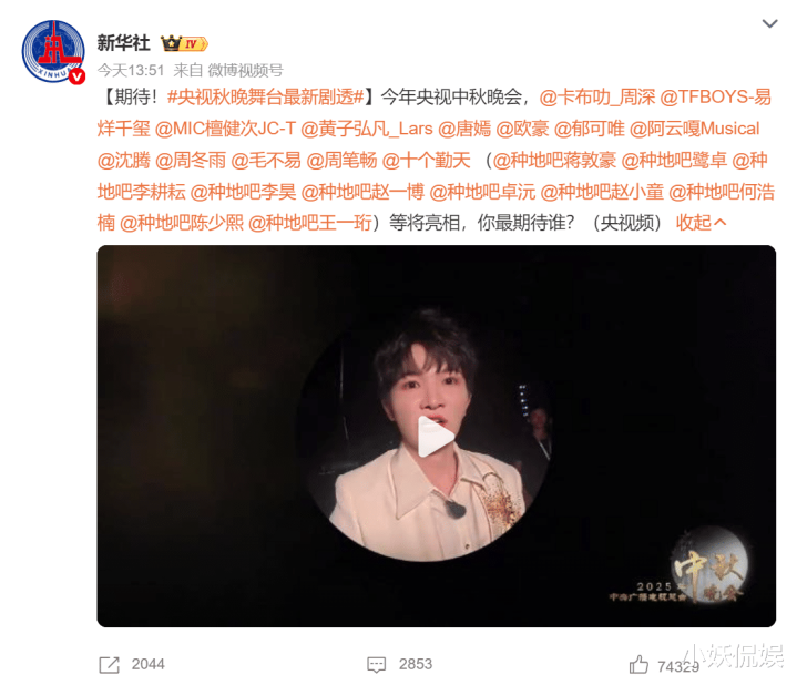 值得一提的是,央视秋晚对周深的重视并非偶然 —— 他的嗓音兼具叙事性与穿透力,既能驾驭《大鱼》这样的国风经典,也能演绎《花开忘忧》这样的温情民谣,完美适配晚会 “多元团圆” 的创作需求。