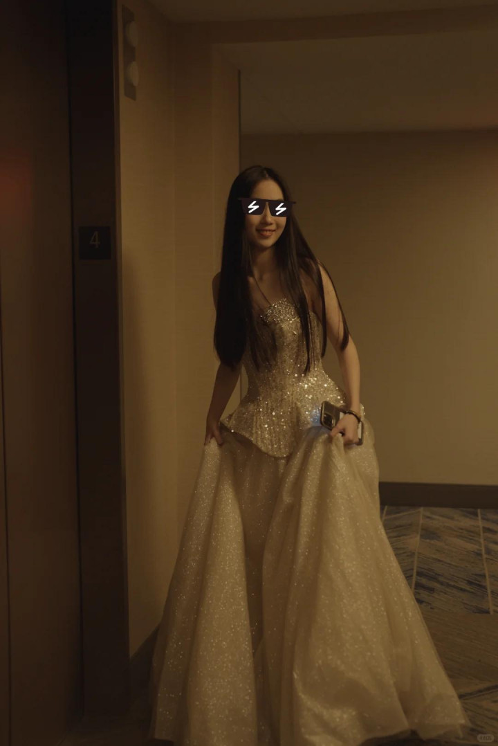 身上那件抹胸礼服镶满细碎水钻,在灯光下闪闪发光,像银河倾泻在肩头,实在是太美了。
